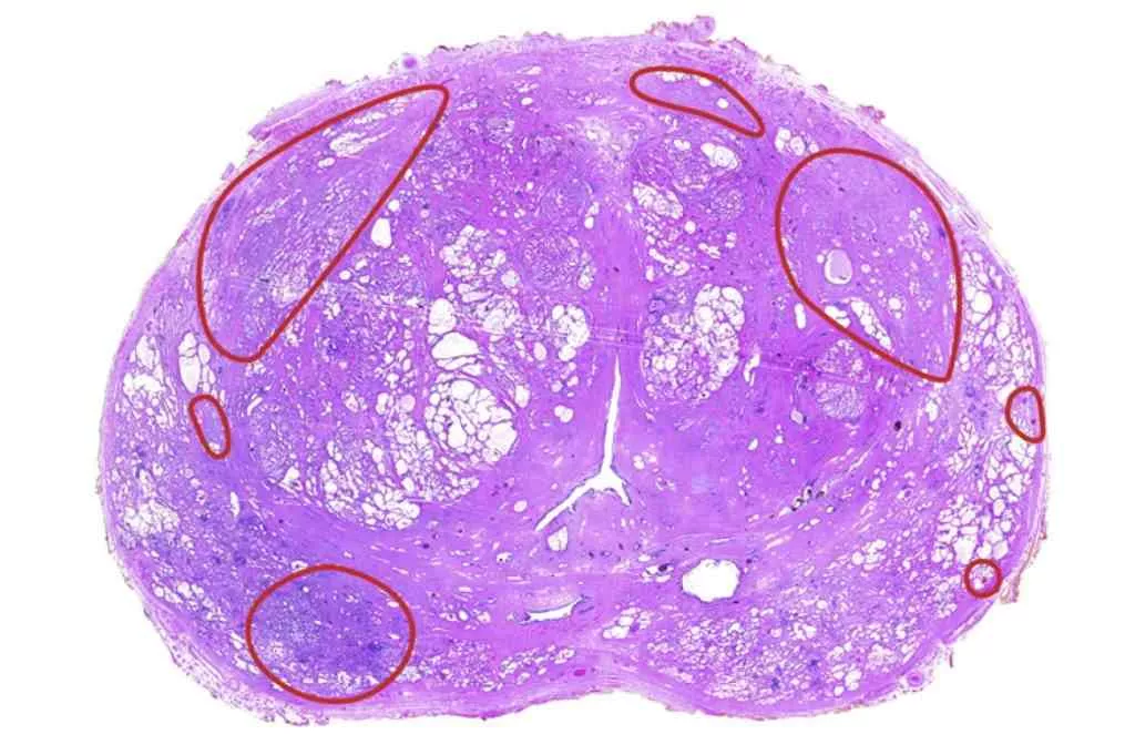 Dans la prostate, quand un cancer se développe, c’est la plupart du temps un cancer multifocal. Cela signifie que la prostate touchée par le cancer dans plusieurs zones. Il peut par exemple exister 6 ou 7 zones touchées, comme cela se voit sur cette image de coupe de prostate. Chaque zone entourée en rouge est une zone de cancer. A noter au milieu en forme de fente à trois côté, l’ouverture de l’urètre…